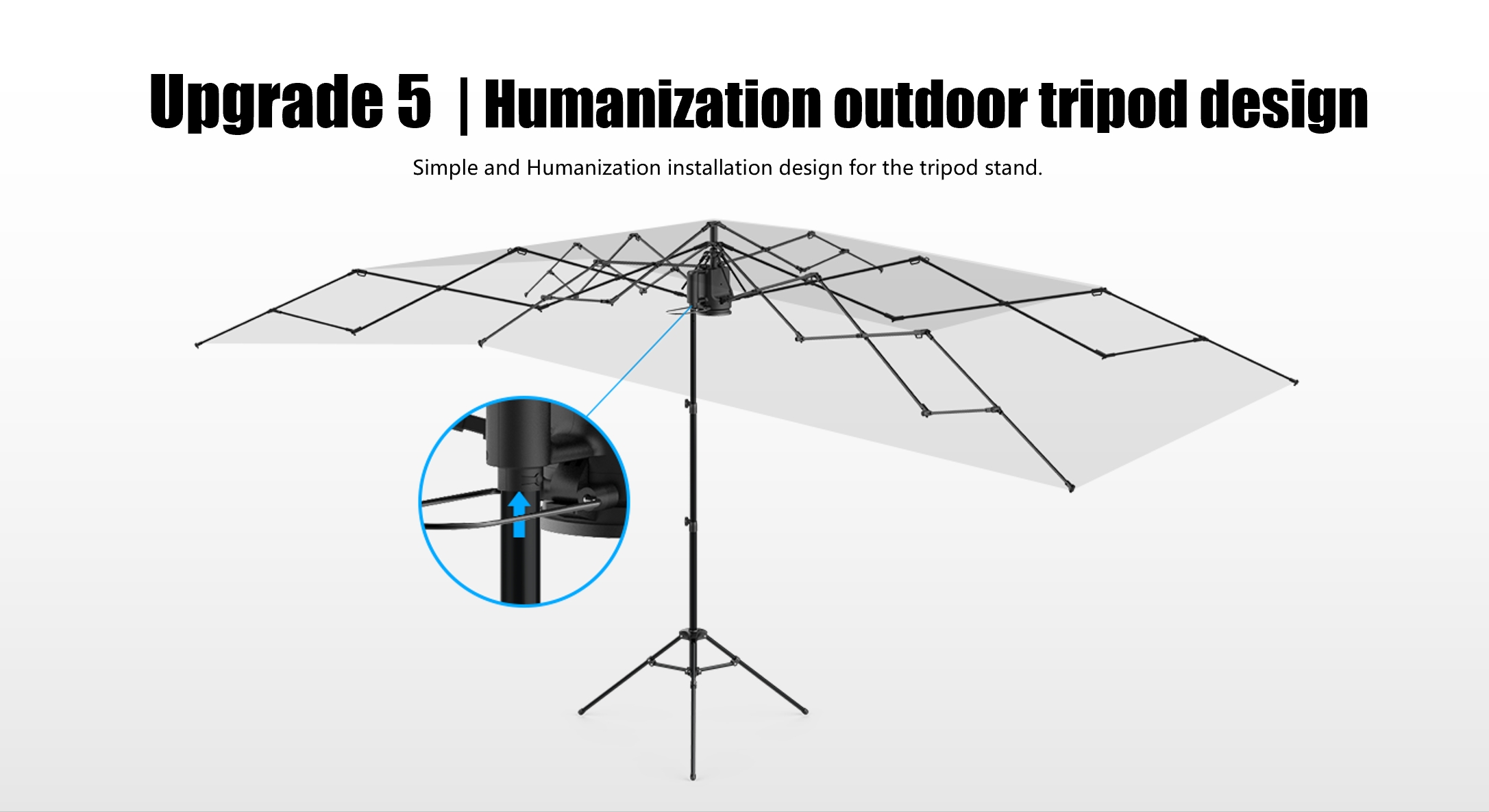 En plus de la montée et de la descente automatiques via la télécommande, il peut également être commuté en mode manuel à tout moment pour s'adapter à différentes préférences. Le moteur optimisé consomme moins d’énergie et est plus économe en batterie. La structure du trépied extérieur spécialement conçue assure une installation plus stable et permet une installation rapide à l'extérieur du véhicule, facilitant ainsi la création d'un pare-soleil temporaire pour les voyages en camping.
