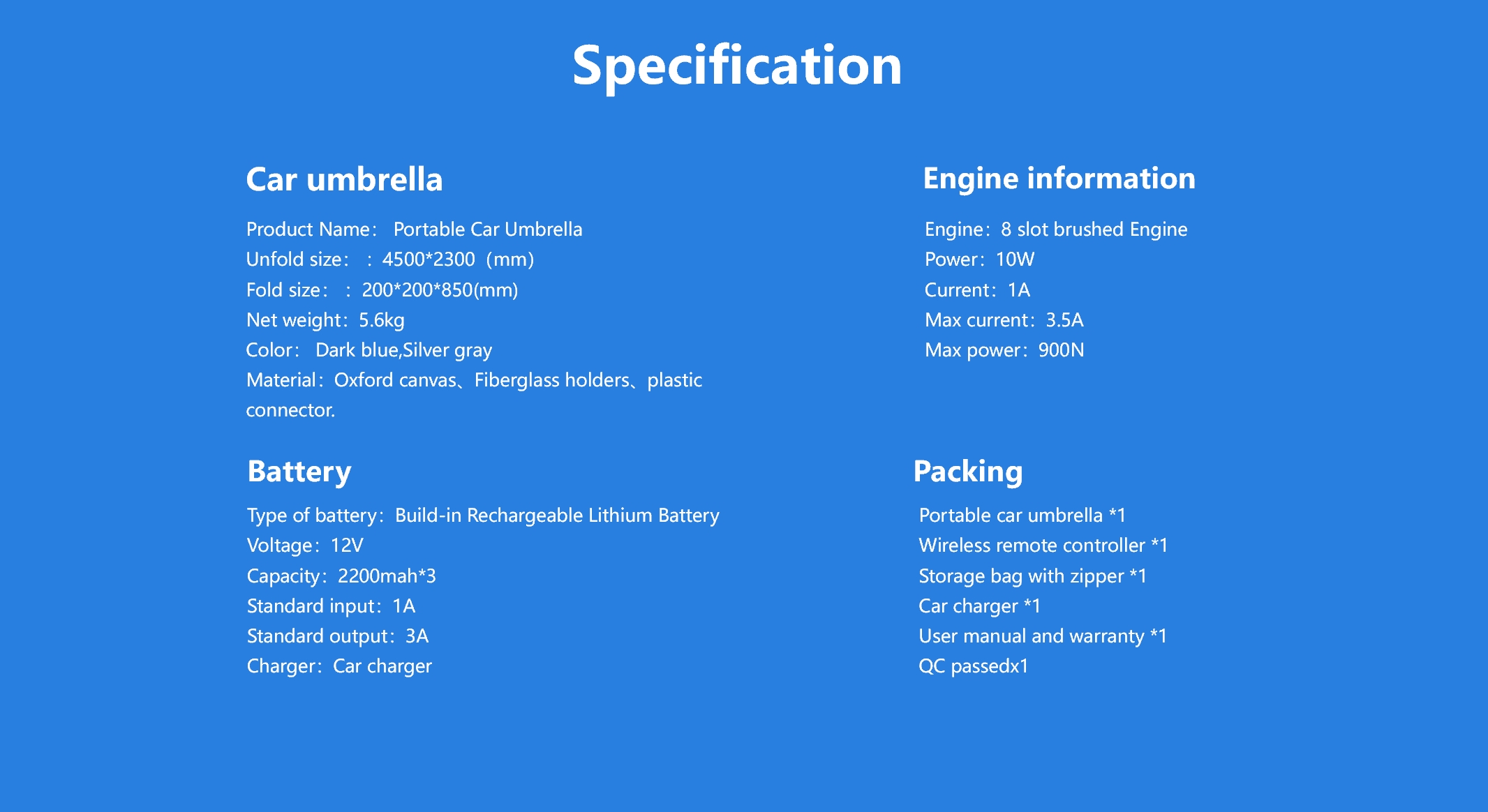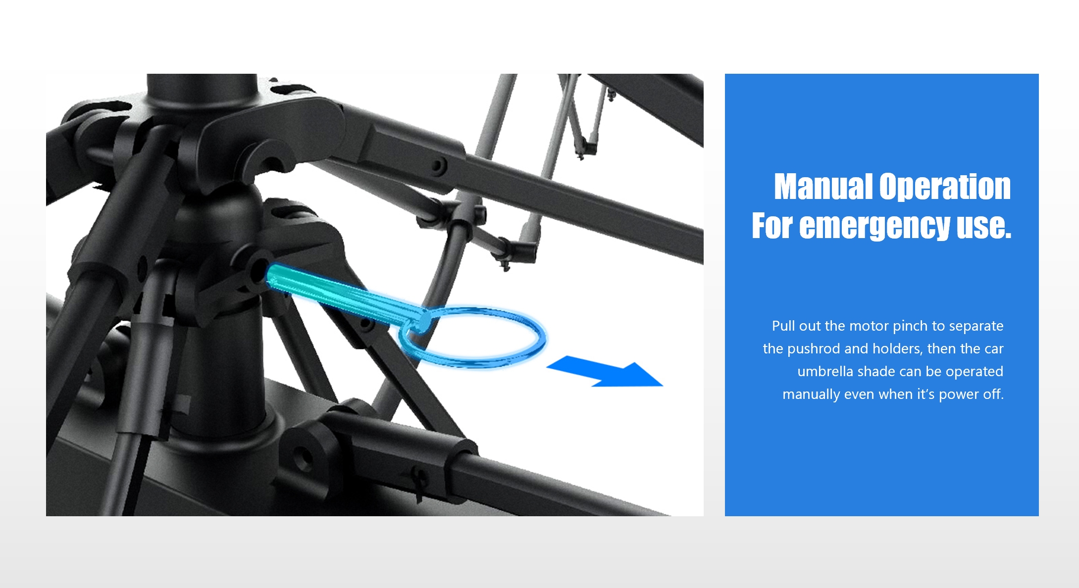 Ce pare-soleil électrique télécommandé de deuxième génération représente une mise à niveau complète par rapport à son prédécesseur. Il utilise des matériaux plus légers et augmente la zone d'ombrage sans compromettre les performances puissantes du moteur, tout en maintenant une ouverture et une fermeture stables à un seul bouton.