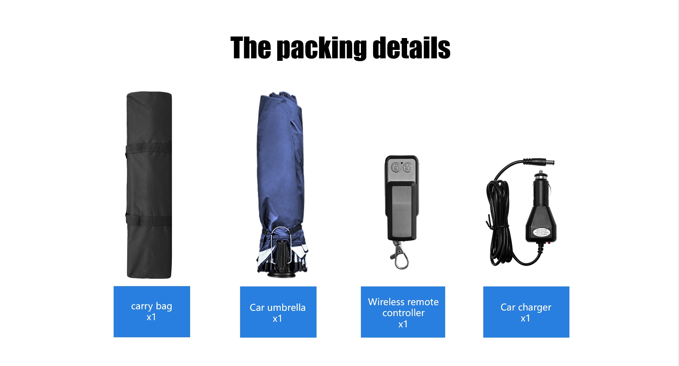 | Accessoires | Parapluie de voiture portable x 1, Sac de rangement avec fermeture éclair x1, Manuel d'utilisation et carte de garantie x1. |
